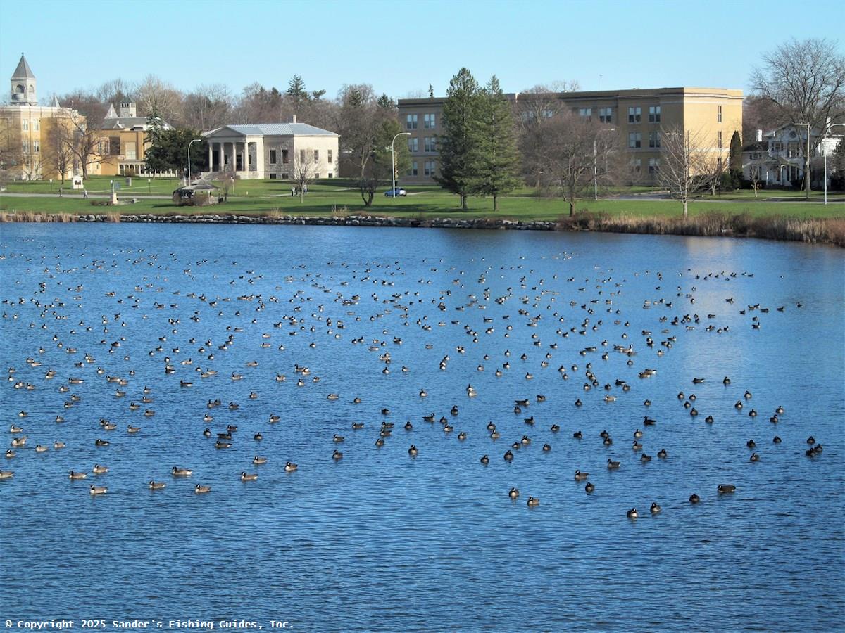 In addition to fishing, the section of Oatka Creek in Leroy also offers two opportunities for paddling and birding. A municipal launch site for canoes and kayaks is located off Munson Street, immediately upstream of a dam. (The map pin is located in the parking area for the launch site.) From here, it's usually possible to paddle as far upstream as an old railroad bridge; upstream of the bridge, the water quickly becomes too fast and shallow to paddle much further. While there is some development along this section of the stream, much of the shoreline is wooded, giving the area a rustic feel. This is a round-trip paddle of 1.4 miles. You can also put in immediately downstream of the dam at Munson Street and paddle down to the widewater area, which is formed by a second dam near Main Street/Route 5. (Don't get too close to the dam). This is a round-trip paddle of 1.8 miles. The widewater area resembles a large pond and is bordered by a mostly wooded shoreline along the west bank and a linear park along the east bank. Both trips offer some interesting scenery, including several islands, and very good birding opportunities (see photos). Surprisingly, no bird sightings for these sections of Oatka Creek have been entered on eBird. To see how you can get started on eBird, see eBird under Links.
